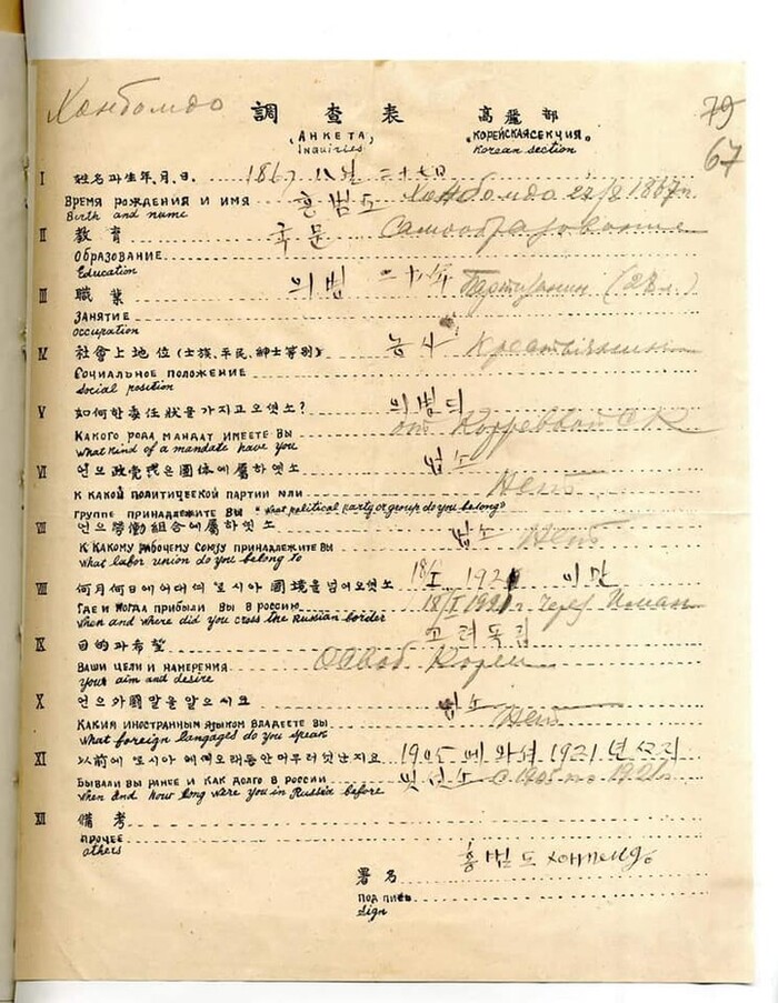 이 시기에는 독립군이 강제로 볼셰비키 혁명군에 편입된 상태였는데 입국신고서에는 자신을 어느 곳에도 속하지 않는 의병이며 '고려' 독립을 위해서 러시아에 들어가려 한다고 명시하고 있음.