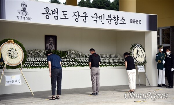 | ▲ 홍범도 장군 유해가 16일 대전현충원 현충관 임시안치소에 안치된 가운데, 정부는 오는 17일까지 현충탑 앞 국민분향소와 온라인 분향소를 마련, 추모기간을 거친 뒤, 18일 안장식을 할 예정. 오마이뉴스 |