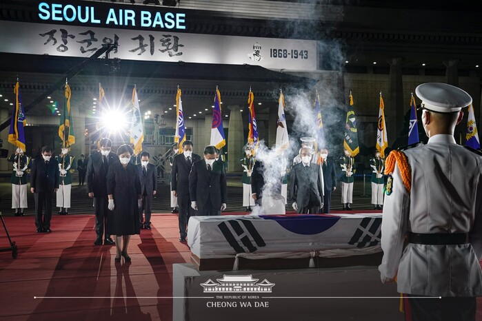 -문 대통령 '뚝심'으로 이뤄낸 유해봉환..'최고예우'로 직접 영접.