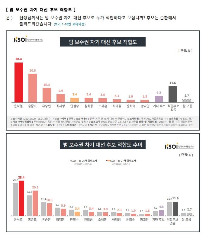 범 보수권 차기 대선 후보 적합도 조사에서는 윤 전 총장이 28.4%를 기록하며 1위에 이름을 올렸지만, 홍준표 의원이 가파른 상승세를 보이며 20.5%로 윤 전 총장을 추격하고 있다.