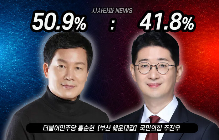 더불어민주당 홍순헌 후보가 50.9%, 국민의힘 주진우 후보가 41.8%로 나타났고 무소속 박주언 후보는 1.6%로 큰 의미를 지니지 못하는 것으로 드러났다.