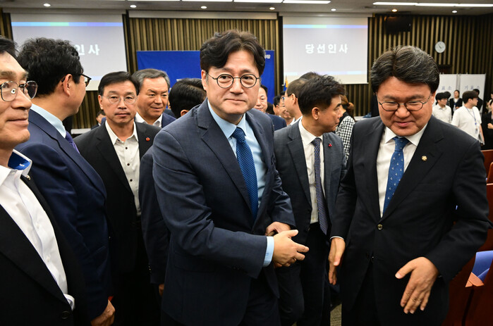 홍 원내대표는 수락 연설에서 "어려울 때 힘든 자리를 맡았다"며 "민주당이 하나의 팀이 돼서 이재명 대표와 함께 내년 총선에서 승리할 수 있는 그런 힘을, 동력을 만들어내겠다"고 말했다.