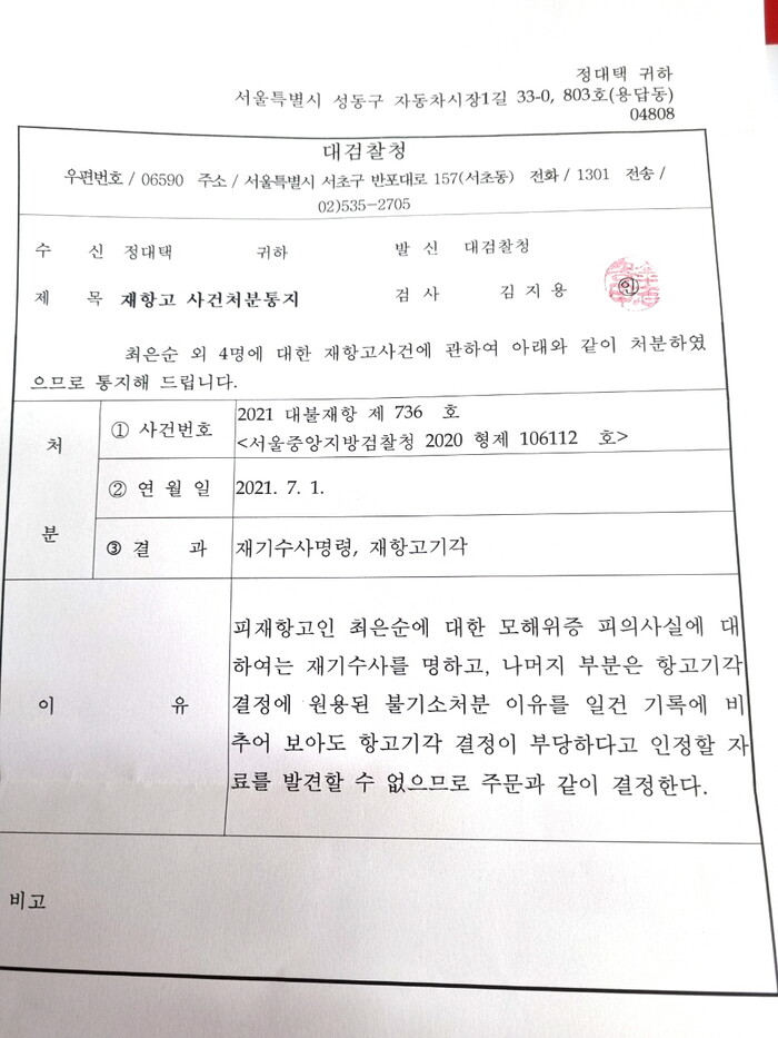 지난해 정대택 씨와 ‘서울의 소리’ 백은종 대표는 당시 재판에서 최은순 씨가 거짓증언을 했다며 모해위증 등 혐의로 고발했지만, 서울중앙지검은 이를 불기소 처분했고 항고도 기각했다. 그런데 대검은 이들의 재항고 중 일부를 받아들여 지난 6일 최 씨의 모해위증 의혹 중 누락이 돼 판단이 빠진 부분에 대한 재수사를 명령했다.