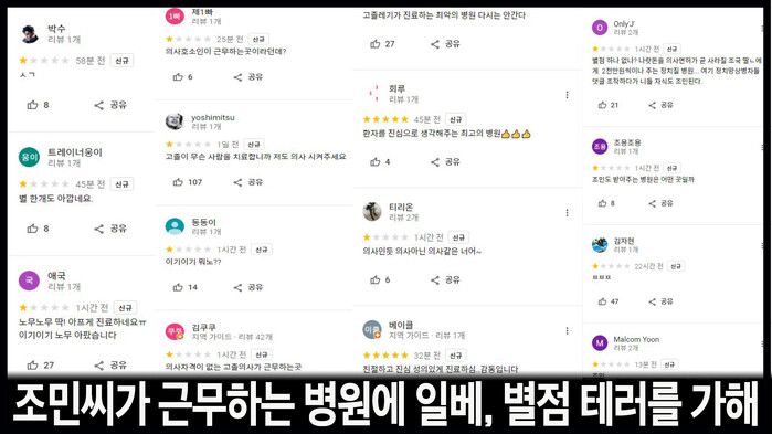 조국 (전)법무부장관의 딸인 조민씨가 근무하는 신천연합병원의 웹 홈페이지 구글과 카카오맵 계정에 일베들이 별점 테러를 하고 있다는 네티즌들의 신고가 본지에 들어왔다.