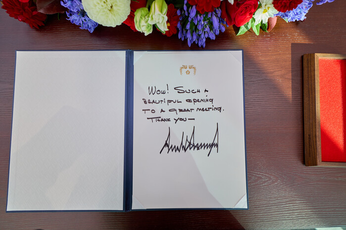 | ▲ 도널드 트럼프 미국 대통령이 29일 경북 경주박물관에서 이재명 대통령과의 한미 정상회담 전 작성한 방명록. 2025.10.29 (사진=연합뉴스) |