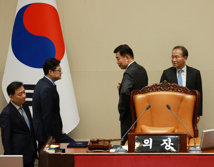 | ▲왼쪽부터 이광재 국회 사무총장, 홍익표 민주당 원내대표, 김진표 국회의장, 윤재옥 국민의힘 원내대표 (사진=연합뉴스) |
