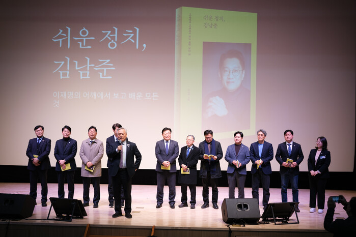 | ▲ 김남준 전 청와대 대변인이 2일 인천 계양구 경인교육대학교에서 열린 '쉬운 정치, 김남준' 북콘서트에서 더불어민주당 정청래 대표, 한병도 원내대표 등 참석자들과 기념 촬영하고 있다. 2026.3.2 (사진=시사타파뉴스 최명훈 기자) |