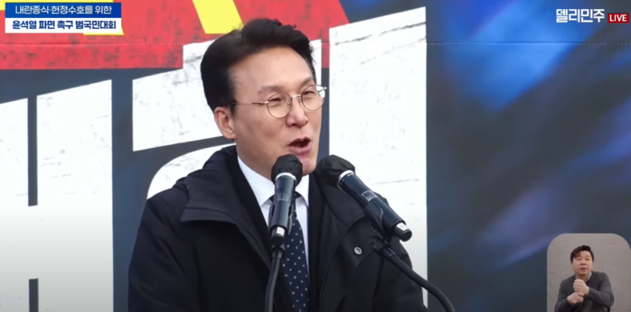 | ▲ 8일 윤석열 파면 촉구 범국민대회 무대에 오른 김민석 더불어민주당 의원 (출처=델리민주) |