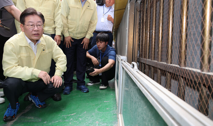 | ▲반지하 물막이 시설을 점검하는 이재명 대표 (사진=연합뉴스) |