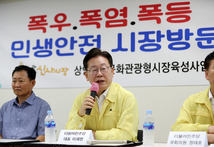 이 대표는 이날 오후 관악신사시장에서 연 상인 간담회에서 "폭염·폭우·(물가)폭등 '3폭'을 국민이 어떻게 견뎌낼 것인가"라며 “여름 폭염 대비 서민 에너지 지원이나 전통 시장을 포함한 중소상공인 여러분의 빚 문제 등 경제적 지원을 위한 추경이다. 추경이 꼭 필요하다"고 강조했다.