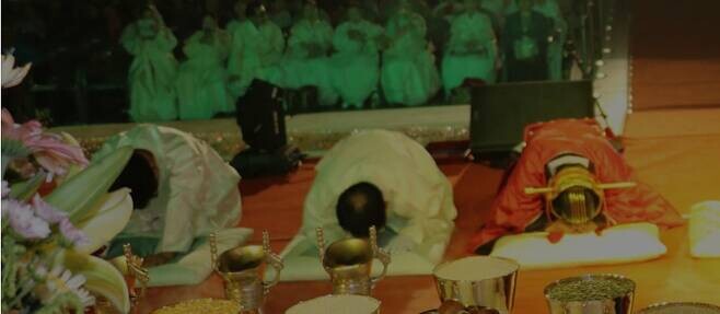 | ▲전통 굿을 하는 무당 등 전국 무교인들은 정치권에서 '무속'이라는 말로 자신들을 비하하고 있다며 설 연휴 뒤 여의도에서 실력행사를 예고했다. 사진은 무교인 연합종단인 경천신명회 홈페이지에 실려있는 전통 굿 장면. 경천신명회 홈페이지 |