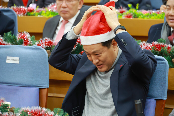 | ▲ 오세훈 서울시장이 22일 국회의원회관에서 국민의힘 서울시당이 연 사랑의 기부금 모금 전달식에 참석해 산타 모자를 쓰고 있다. 2025.12.22 (사진=연합뉴스) |