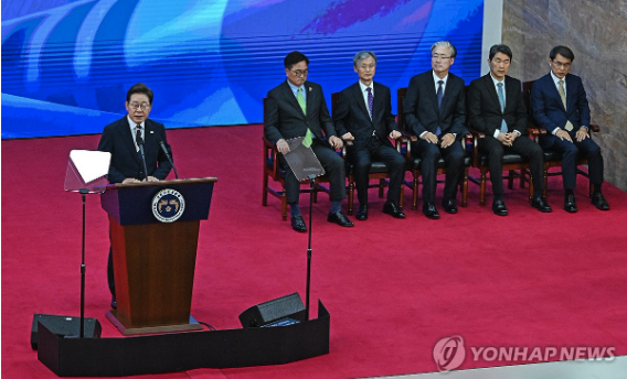 | ▲ 이재명 대통령이 제21대 대통령 취임선서식에서 취임 연설을 하고 있따. 뒷편 왼쪽부터 우원식 국회의장, 조희대 대법원장, 김형두 헌법재판소장 권한대행, 이주호 전 대통령 권한대행 부총리 겸 교육부 장관, 노태악 중앙선거관리위원장. 2025.6.4 (사진=연합뉴스) |