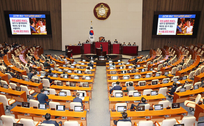| ▲김건희 여사 발언을 화면에 띄운 대정부 질문 (사진=연합뉴스) |