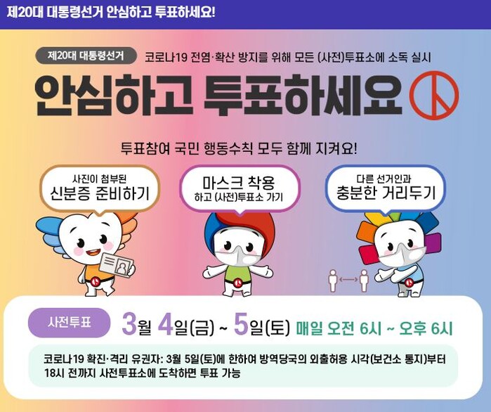 제20대 대통령선거 사전투표가 4일 오전 6시 전국 3천552개 사전투표소에서 일제히 시작됐다. 사전투표는 이날부터 이틀간 오전 6시부터 오후 6시까지 진행된다. 이 기간 유권자는 별도 신고 없이 가까운 사전투표소 어디서나 투표할 수 있다.