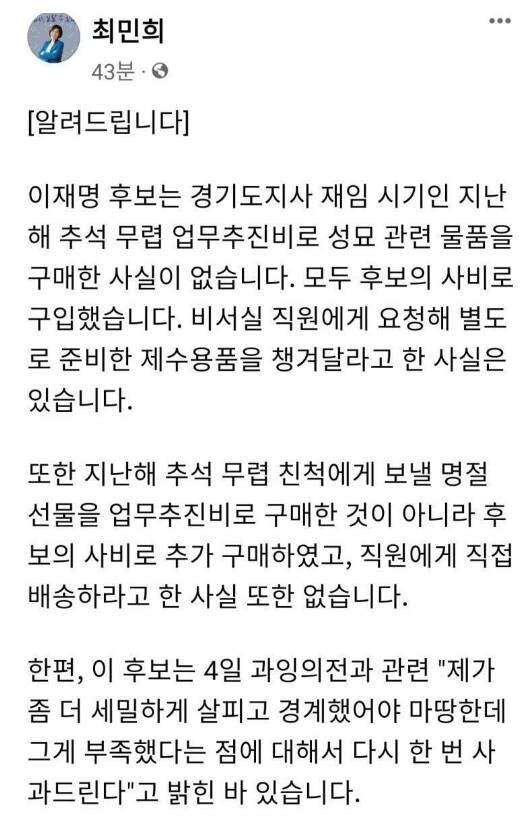 [더불어민주당 선대위 공보단 발표] 이재명 후보는 경기도지사 재임 시기인 지난해 추석 무렵 업무추진비로 성묘 관련 물품을 구매한 사실이 없습니다. 모두 후보의 사비로 구입했습니다. 비서실 직원에게 요청해 별도로 준비한 제수용품을 챙겨달라고 한 사실은 있습니다. 또한, 지난해 추석 무렵 친척에게 보낼 명절 선물을 업무추진비로 구매한 것이 아니라, 후보의 사비로 추가 구매하였고, 직원에게 직접 배송하라고 한 사실 또한 없습니다. 한편, 이 후보는 4일 과잉의전과 관련 "제가 좀 더 세밀하게 살피고 경계했어야 마땅한데 그게 부족했다는 점에 대해서 다시 한 번 사과드린다"고 밝힌 바 있습니다. |