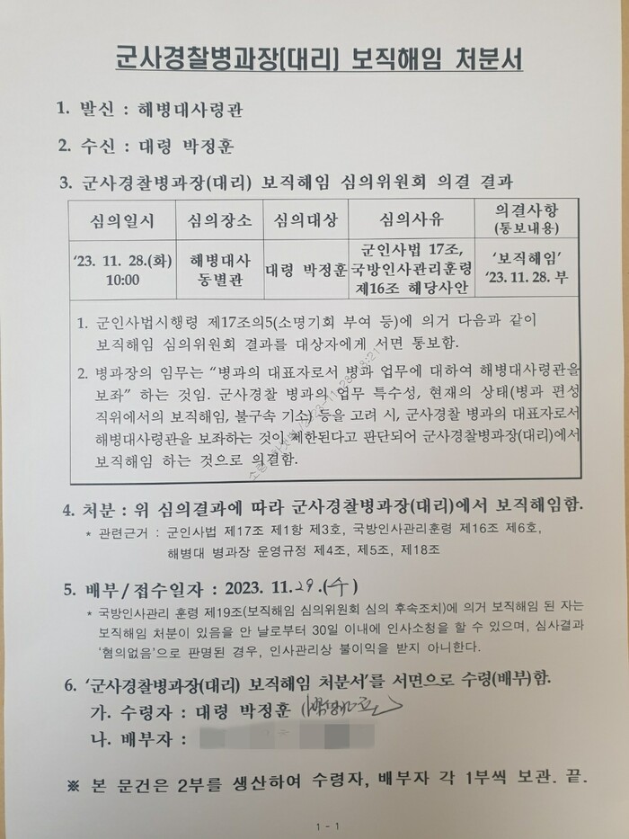 | ▲보직해임 처분서 (사진=연합뉴스) |