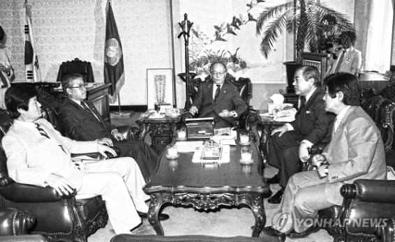 | ▲ 1987년 개헌 논의, 국회의장·4당 총무회담. 이재형 국회의장(가운데)과 민주당 김현규, 민정당 이대순, 국민당 양정규, 신민당 정재원 4당 총무가 개헌공동발의 연기에 따른 대책을 협의하는 모습. 2025.4.7 (사진=연합뉴스) |