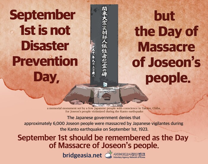 포스터에는 "일본 정부는 9월 1일 발생한 관동대지진 당시 일본인 자경단에 의해 약 6천명에 달하는 조선인 학살을 부정하고, 방재의 날(지진, 재난을 막는 행사)로 기념하고 있습니다"라는 내용이 들어있다.