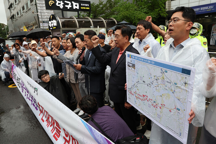 이날 국민의힘 소속 전진선 양평군수는 지역 주민 대표 등 30여명과 함께 서울 여의도 민주당사를 찾아 "나들목(IC)이 있는 서울-양평 고속도로를 가로막는 민주당의 모든 행위를 중단해 달라"고 촉구했다.