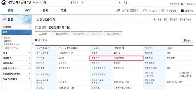 | ▲ 7월24일 국방전자조달시스템에 공개된 입찰공고. 정보사령부 '제9965부대'가 '훈련영화피복 제조' 를 공고했다. (출처=국방전자조달시스템) |