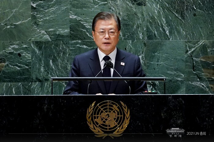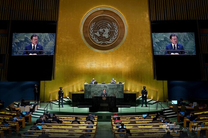 문재인 대통령은 21일 오후(현지시각) 유엔 총회장에서 제76차 유엔 총회 고위급회기 기조연설을 했다. 문 대통령은 우리나라 대통령 중 유일하게 유엔 총회에 다섯 번 모두 참석하였고 기조연설을 통해 국제사회에 한반도 평화와 한국의 선도적 역할, 포용적 회복에 대한 비전과 실천을 강조해왔다.