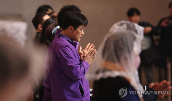 | ▲ 서울 중구 명동대성당에서 열린 이태원 참사 1주기 추모 미사에서 유형우 10.29이태원참사유가족협의회 부위원장과 유가족들이 기도하고 있다. 2023.10.29 (사진=연합뉴스) |