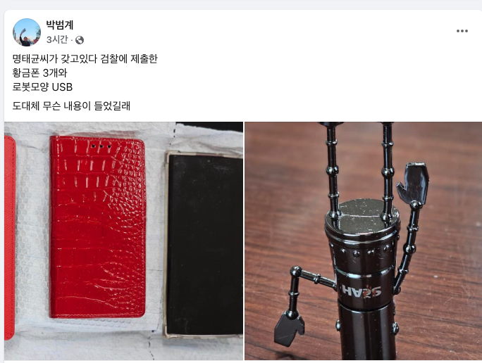 이에 대해 박범계 의원은 "명태균 씨가 갖고 있다 검찰에 제출한 황금폰 3개와 로봇 모양 USB"라고 설명하면서 "도대체 무슨 내용이 들었길래"라고 덧붙였다.