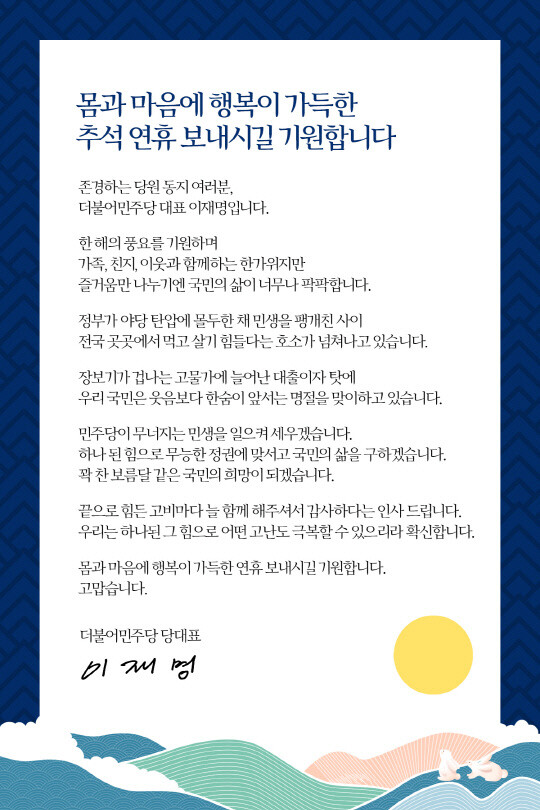 | ▲이재명 대표의 당원 추석 인사 (이미지=더불어민주당) |