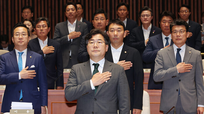 | ▲ 정책 의원총회에 참석한 박찬대 원내대표와 진성준 정책위의장 등 의원들(사진=연합뉴스) |