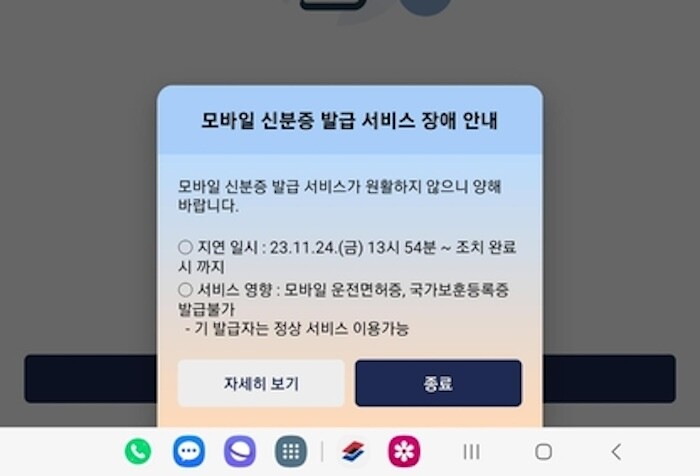 이후 5시를 넘어서도 모바일 신분증 발급 절차 등을 안내하는 웹사이트만 접속이 될 뿐, 실제 모바일 신분증을 발급하는 앱 서비스는 전면 중단된 상태다.