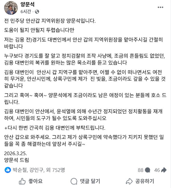 양 전 의원은 25일 페이스북을 통해 김용 전 경기도 대변인에게 안산갑 지역위원장을 맡아줄 것을 요청하며 사실상 출마를 권유했다. 그는 “시민께 진 빚을 갚아달라”는 표현까지 사용하며 공개 호소에 나섰다.