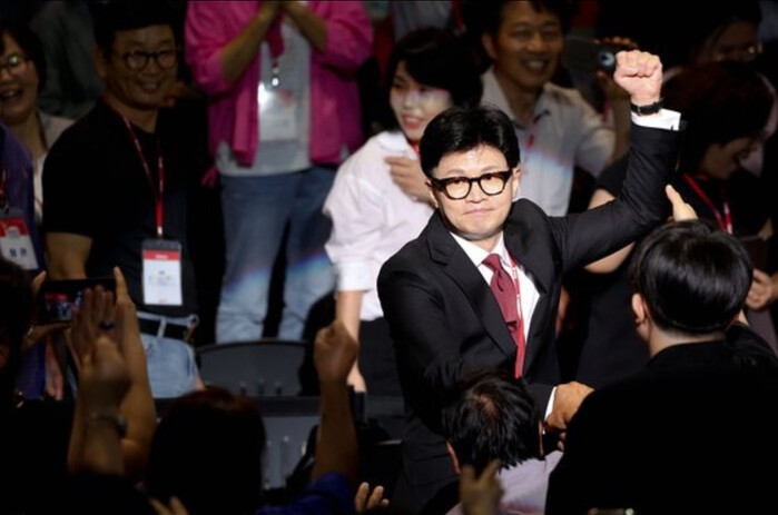 한동훈 대표는 23일 일산 킨텍스에서 열린 국민의힘 7·23전당대회에서 원희룡 나경원 윤상현 후보를 꺾고 당대표에 올랐다.