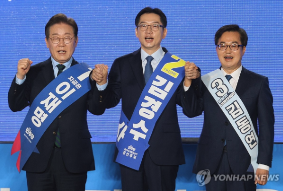 | ▲ 19일 오후 충북 청주체육관에서 열린 '제21대 대통령선거 후보자 선출을 위한 충청권 합동연설회. 왼쪽부터 이재명,김경수,김동연 후보 (사진=연합뉴스) |