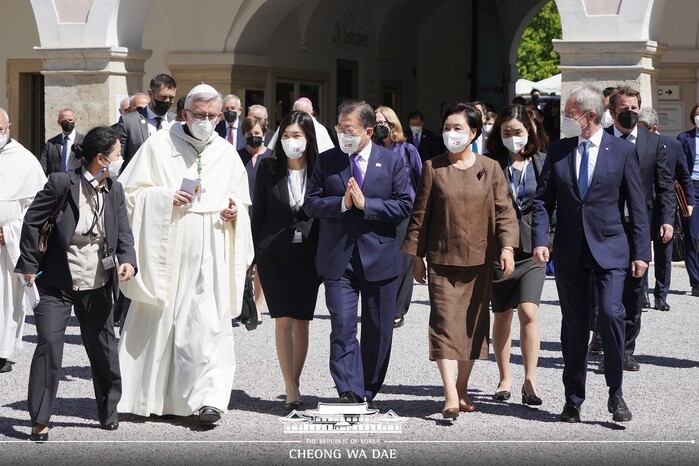 오스트리아를 국빈방문 중인 문재인 대통령 부부는 6월 15일 오전(현지시각) 판 데어 벨렌 대통령 부부와 함께, 하일리겐크로이츠 수도원을 방문했다. 막스밀리안 하임 수도원 원장은 “긴 역사를 자랑하는 하일리겐크로이츠 수도원에는 100여 명의 수도사가 매일 기도”한다며, “조각가 조반니 줄리아니는 이곳에 30여 년 머무르며 페스트 퇴치”를 기념한 성 삼위일체 탑을 세웠다고 소개하고, “코로나 시기에, 이전에 페스트를 이겨낸 경험”을 상기할 필요가 있다고 말했다.