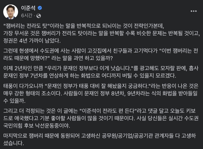 14일 이 전 대표는 자신의 페이스북에 "잼버리는 전라도 탓"이라는 말을 반복적으로 되뇌이는 것이 전략인가본데, 가장 무서운 것은 잼버리가 전라도 탓이라는 말을 반복할 수록 비슷한 문제는 반복될 것이고, 정권은 4년 가까이 남았다"고 적었다.