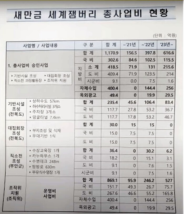 이 전대표는 새만금 세계잼버리 총사업비 현황 자료 문서를 공개했다.