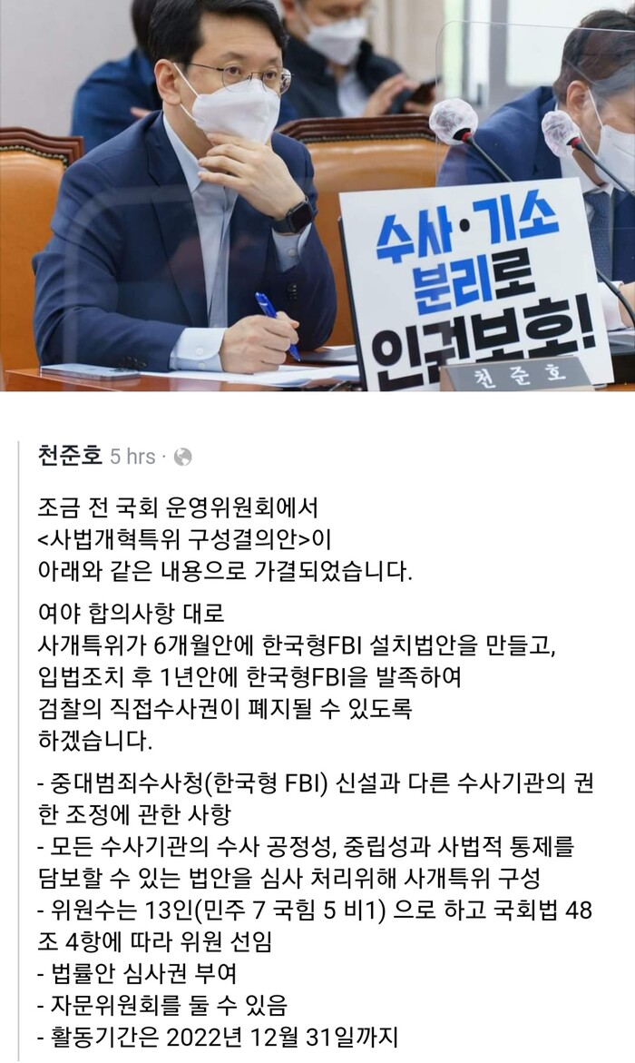 사개특위는 6개월 간 중수청 관련 입법을 마무리하고, 이후 1년 이내 중수청을 발족한다. 그렇게 되면 현재 남아있는 검찰의 직접 수사권은 모두 폐지된다. 사개특위는 민주당 7인, 국민의힘 5인, 비교섭단체 1인 등 모두 13인으로 구성한다. 위원장은 민주당이 맡는다.