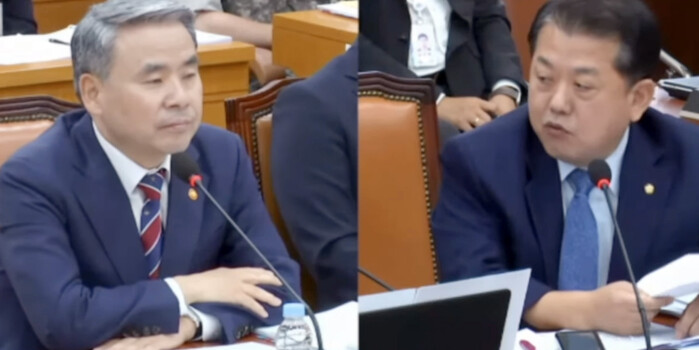 | ▲국회TV를 통해 질의응답하는 이종섭 장관과 김병주 의원. 본지 기사 출력물로 보이는 인쇄물이 들고 있다 (사진=연합뉴스) |