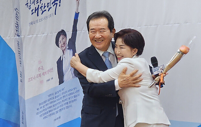 | ▲정세균 전 총리와 끌어안은 전혜숙 의원 (사진=전혜숙 지지모임) |