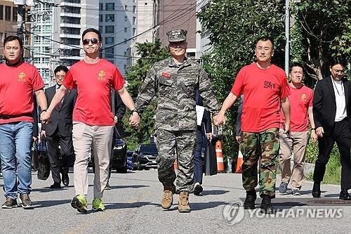 한편, 오전 9시 30분께 박 전 단장과 함께 군사법원 출입문 앞으로 온 해병대 동기들은 해병대 군가인 '팔각모 사나이'를 부르며 박 전 단장을 응원했다.