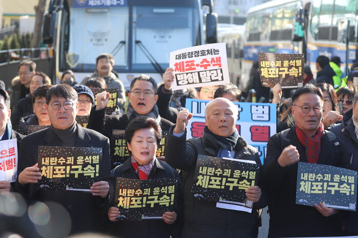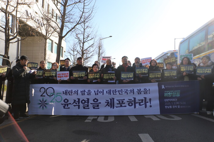 박석운 한국진보연대 상임대표는 “탄핵이든 조사든 당당히 받겠다던 윤 대통령은 비겁하고 구차한 행보를 보이고 있다. ‘법 꼼수’에 체포영장 효력도 스스로 거부한다. 전형적인 사법 방해”라고 목소리를 높였다.