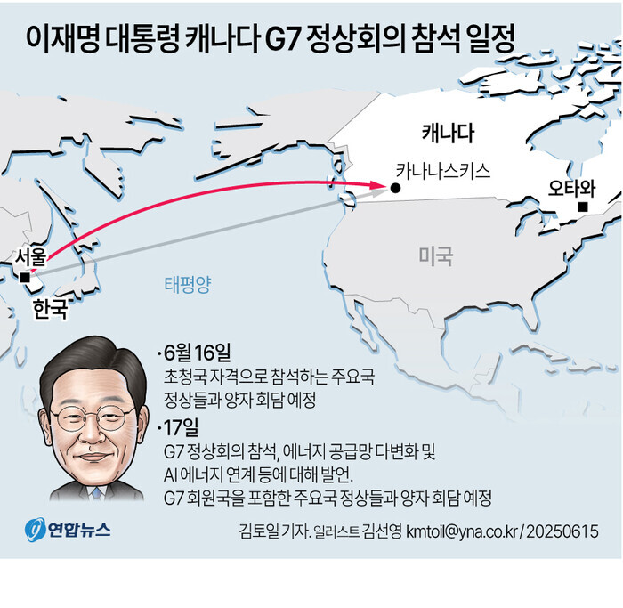 이재명 대통령은 캐나다에서 열리는 주요 7개국(G7) 정상회의 참석을 위해 16일 서울공항을 통해 출국했다. 취임 12일 만의 첫 해외 방문이다.