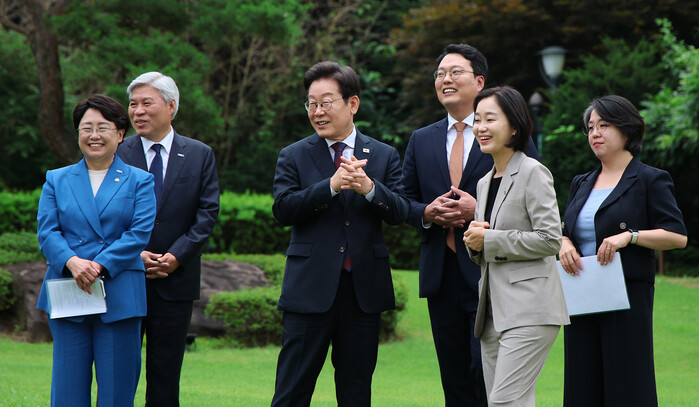 | ▲ 왼쪽부터 진보당 윤종오 원내대표, 사회민주당 한창민 당대표, 개혁신당 천하람 당대표권한대행, 조국혁신당 김선민 당대표권한대행, 이 대통령, 진보당 김재연 상임대표, 기본소득당 용혜인 당대표, 조국혁신당 서왕진 원내대표. 2025.7.3 (사진=연합뉴스) |