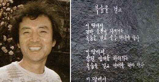 | ▲ 1982년 11월 이른바 ‘오송회 사건’의 주모자로 몰려 7년형을 받은 군산제일고 교사이자 시인 이광웅(왼쪽)씨는 4년8개월 만인 87년 사면을 받아 풀려났으나 92년 위암으로 일찍 세상을 떠나고 말았다. 금강 하굿둑에 있는 그의 시비(오른쪽)에 친필시 ‘목숨을 걸고’가 새겨져 있다. 원문보기: https://www.hani.co.kr/arti/society/society_general/429301.html#csidx519eeb11200fd61be9ef390529699d8 ![]() |