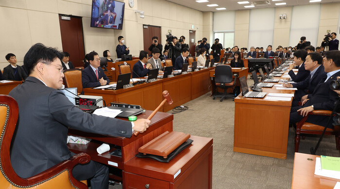 | ▲의사봉을 두드리는 장제원 위원장 (사진=연합뉴스) |