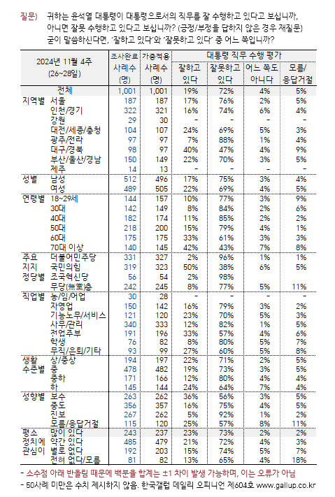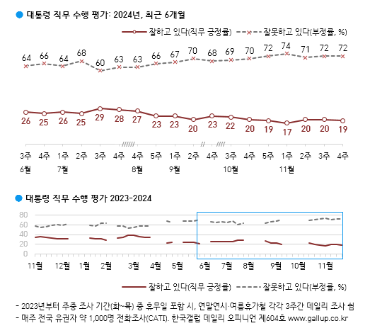 29일 한국갤럽이 발표한 여론조사에 따르면, 윤 대통령 직무수행 긍정평가는 19%로 전주 대비 1%포인트 떨어졌다. 부정평가는 72%로 전주와 같았다.