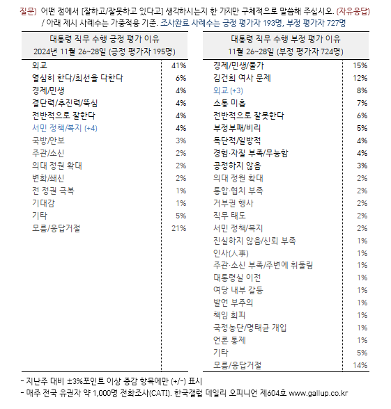 대통령 직무 수행 평가에 긍정 평가를 한 이유는 '외교'가 41%로 압도적이었고, 부정평가의 이유는 경제/민생/물가 15%, 김건희 여사 문제가 12%였고, 외교와 소통 미흡 등이 그 뒤를 이었다.