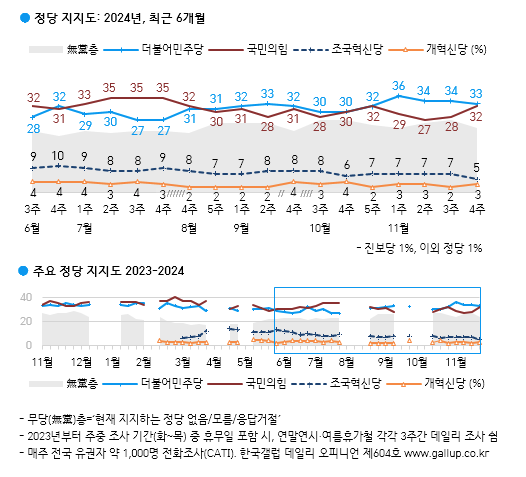 | ▲ 정당지지율 더불어민주당 33%, 국민의힘 32% (출처=한국갤럽) |