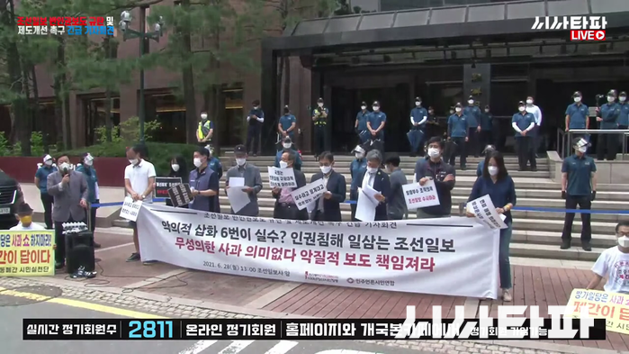 ‘조선동아 거짓과 배신의 100년 청산 시민행동’이 28일 조선일보사 앞에서 긴급 기자회견을 열고 조국 전 장관 부녀·문재인 대통령 삽화 논란에 대해 면피성 해명은 의미가 없으며 방상훈 조선일보 사장이 직접 사과하라고 요구했다. 국회와 정부를 향해서는 언론 책임 강화를 위한 노력을 요구했다.